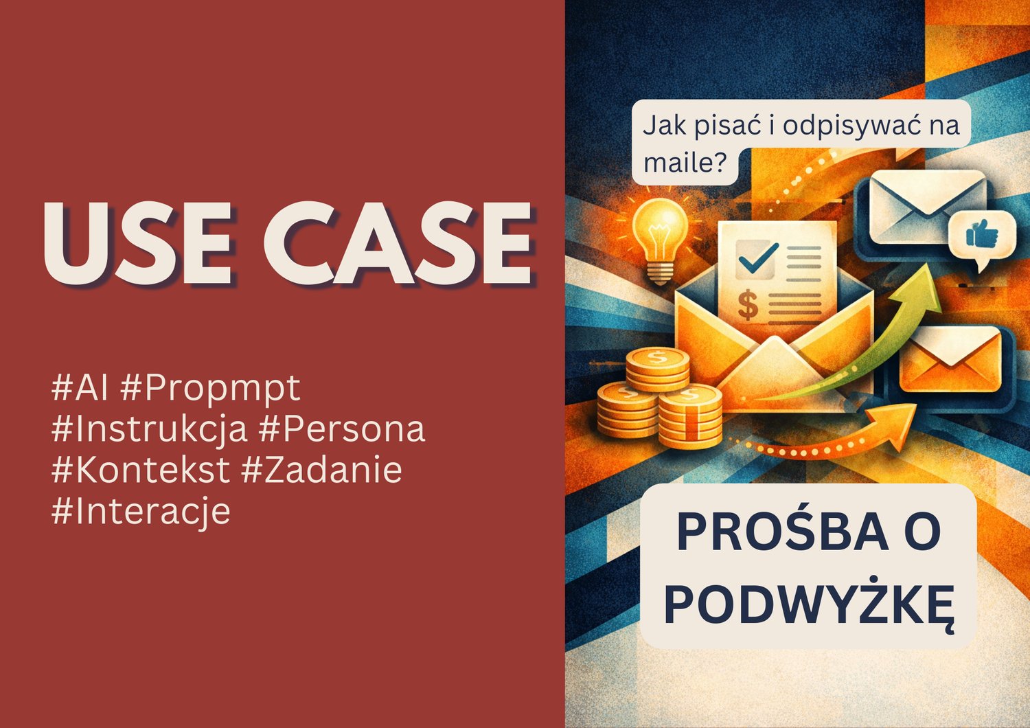 Ten use case demonstruje praktyczne wykorzystanie sztucznej inteligencji w komunikacji na przykładzie pisania i odpowiadania na maile. Podczas prezentacji omówiono, jak przygotować prośbę o podwyżkę oraz wykorzystać modele językowe do generowania spójnych, profesjonalnych odpowiedzi na typowe zapytania, zgodnych z polityką firmy. Przedstawiono konkretny przykład analizy maila od pracownika z prośbą o podwyżkę oraz proces tworzenia trzech wariantów odpowiedzi, pokazując jak AI pozwala oszczędzać czas przy zachowaniu wysokiej jakości komunikacji. Materiały zawierają gotowe prompty, przykłady interakcji z modelem oraz analizę rezultatów. Może być on szczególnie przydatny dla menedżerów szukających sposobów na optymalizację procesów komunikacyjnych w swoich zespołach oraz pracowników, którzy nie tylko chcą nauczyć się jak napisać podanie z użyciem AI, ale także dobrze przygotować się do rozmowy z kierownikiem o podwyżkę.