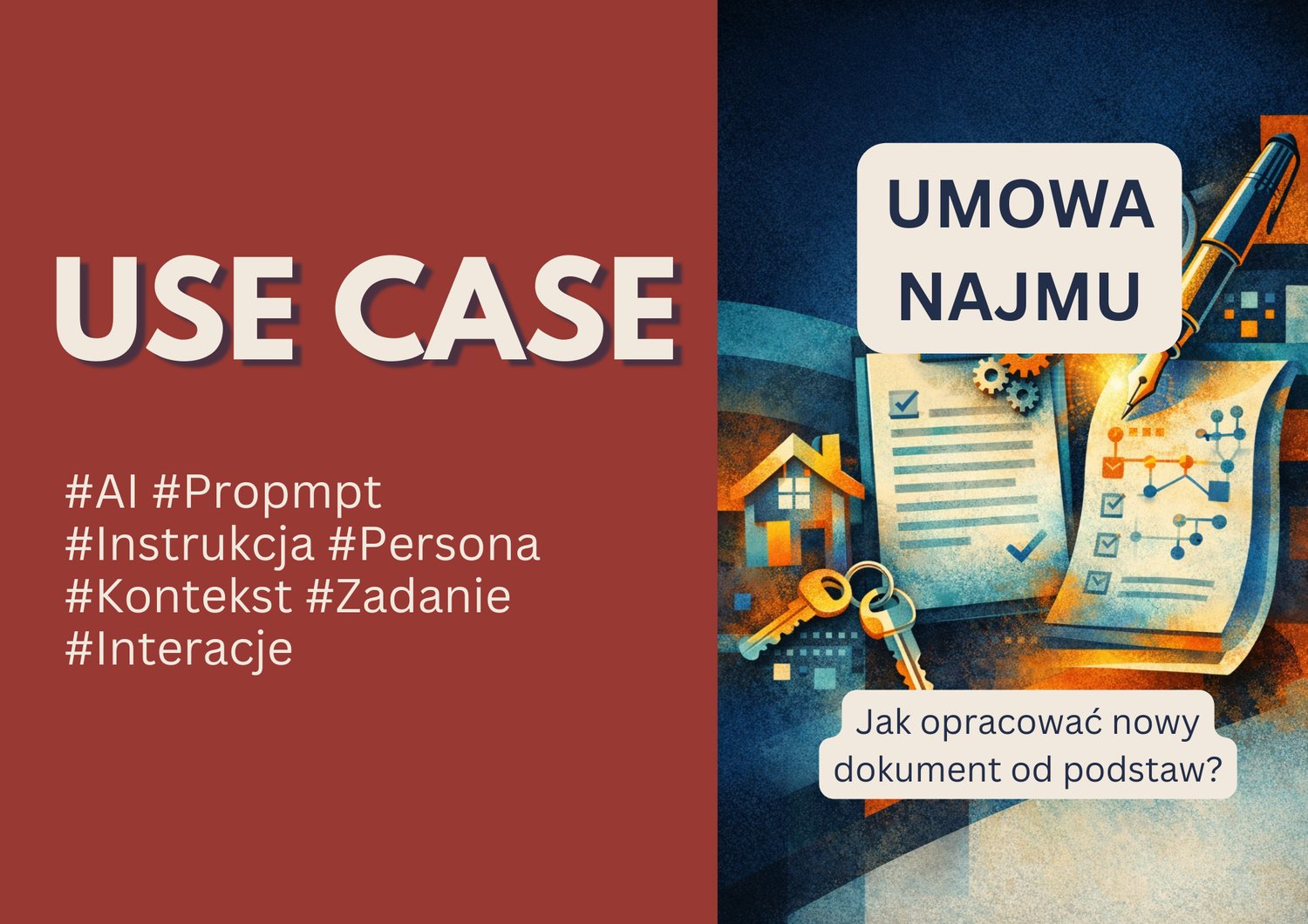 W ramach tego use case zaprezentowano jak tworzyć od podstaw wzory dokumentów prawnych przy pomocy AI na przykładzie umowy najmu mieszkania. Proces obejmował nadanie modelowi roli eksperta w dziedzinie polskiego prawa nieruchomości, analizę aktów prawnych regulujących najem, generowanie struktury umowy zgodnej z wymogami prawnymi, wypełnianie jej konkretnymi danymi oraz krytyczną ocenę gotowego dokumentu pod kątem ryzyk i braków. Przedstawiono praktyczny scenariusz współpracy z AI asystentem prawnym - od zdefiniowania ram zadania, przez systematyczne zbieranie niezbędnych informacji, aż po tworzenie spersonalizowanego, gotowego do podpisu dokumentu wraz z wymaganymi załącznikami. Materiały te stanowią wartościowy przewodnik dla wszystkich chcących wykorzystać AI do tworzenia zgodnych z prawem i zabezpieczających interesy stron umów.