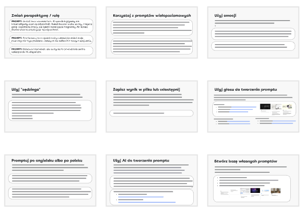 Podczas tego ćwiczenia omówiono praktyczne porady i sztuczki dotyczące efektywnego wykorzystania sztucznej inteligencji w codziennej pracy. Uczestnicy poznali szereg technik usprawniających formułowanie promptów, takich jak np. używanie popularnych skrótów, proszenie o kilka wersji odpowiedzi, stosowanie metody "łańcucha myśli", rozbijanie zapytań na kroki, dodawanie kryteriów wyboru czy zmiana perspektywy. Ponadto, zaprezentowano zaawansowane metody, jak wykorzystanie emocji w promptach, techniki "adwokata diabła", "sędziego", metapromptingu oraz inne wskazówki dotyczące narzędzi usprawniających pracę z AI. Materiały te mogą zainteresować osoby pragnące podnieść jakość interakcji z modelami AI i uzyskać bardziej precyzyjne, kreatywne oraz wartościowe odpowiedzi.